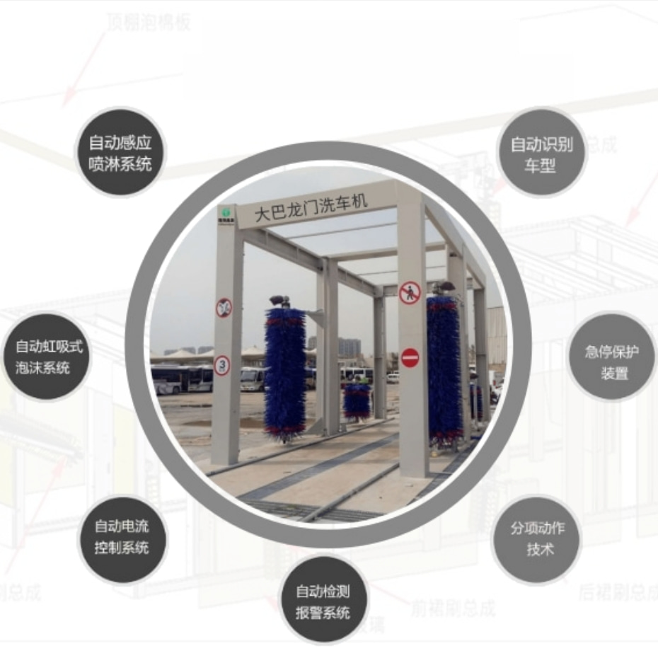 通过式大巴洗车机主要是利用超软耐磨毛刷,和高压水来清洗车辆,通过电脑感应系统进行自动化检测车辆,分析车辆的款式和外形,并采用毛刷和高压水的最佳适合角度,对车辆不同的外观进行快速的清洗作业,避免对车辆外观造成的损害,提高了车辆的清洗速度。